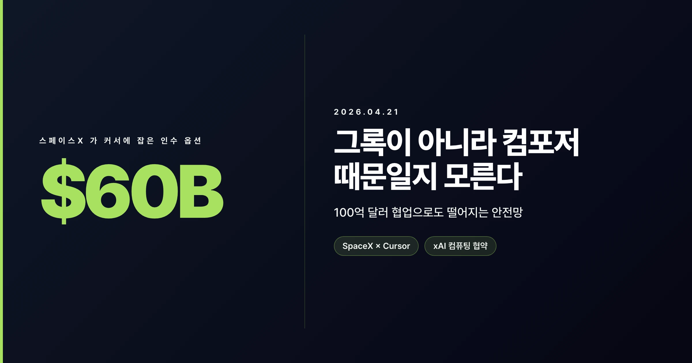 뉴스 기사 한 줄로 이 소식을 봤다. 1년 반쯤 커서를 써 온 사람이라 그저 흘려 넘기기는 어려웠다. 일론 머스크가 또 큰 베팅을 했네 정도로 넘기려다, 커서 안에는 이미 그록(Grok) 이 들어와 있다는 사실이 떠올랐다. 그러면 뭘 더 사겠다는 걸까. 거기서부터 들여다보기 시작했다.