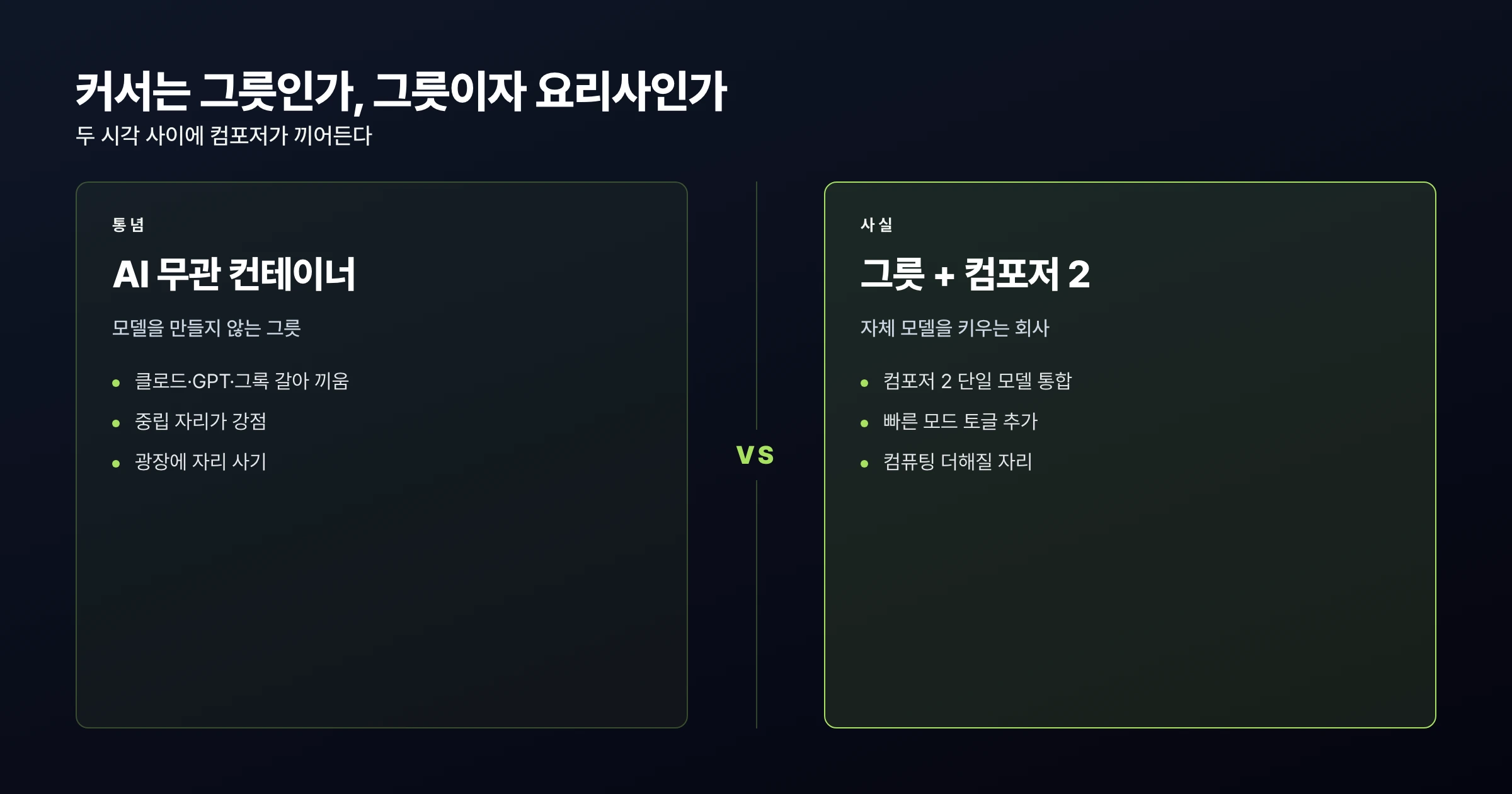 자체 모델이 있다는 건 작지 않은 사실이다. 커서가 "그릇" 만이 아니라 "그릇 + 자기 모델" 이라는 의미다. 모델 회사들 사이에서 중립을 지키는 그릇이 되겠다고 말하면서, 안에는 자기가 키운 모델도 따로 놓는 자리.