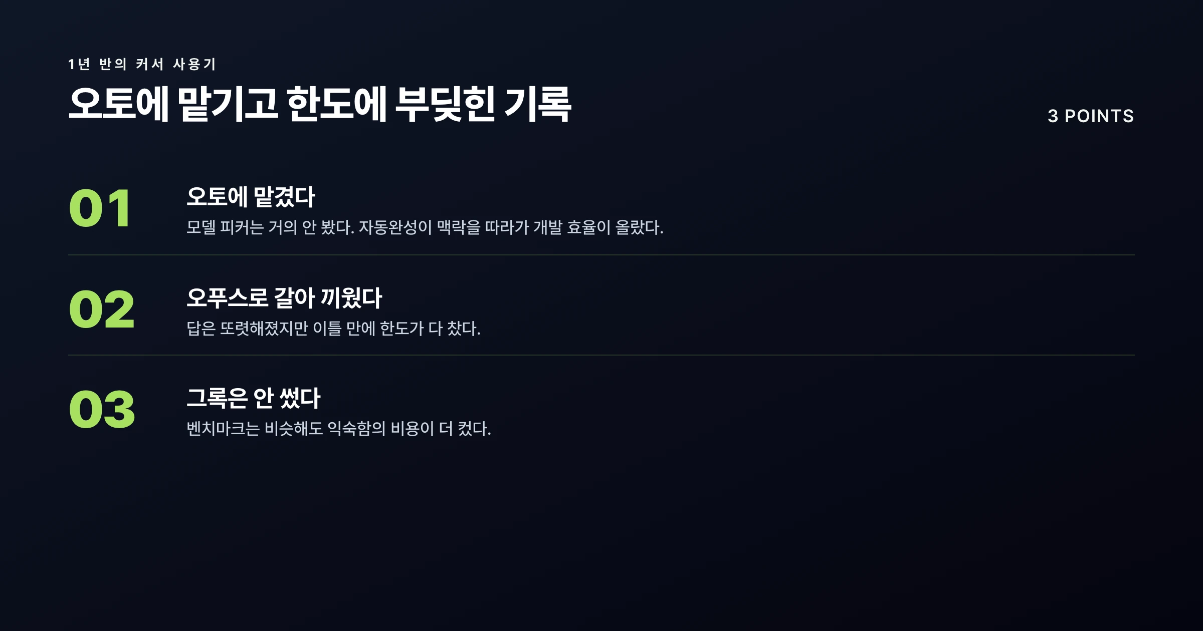 그록과 커서가 만나 컴포저가 더 좋아지면 좋겠다. 그 자극에 엔트로픽이 한 발 더 내디디면, 그 사이에서 이득을 보는 건 사용자 쪽이다. 한 회사가 시장을 다 쥐는 그림보다 그게 훨씬 낫다. 오늘은 오토 모드에 머물고 있지만, 그 다툼이 본격화되면 한 번 진지하게 모델 피커를 다시 들여다볼 생각이다.
