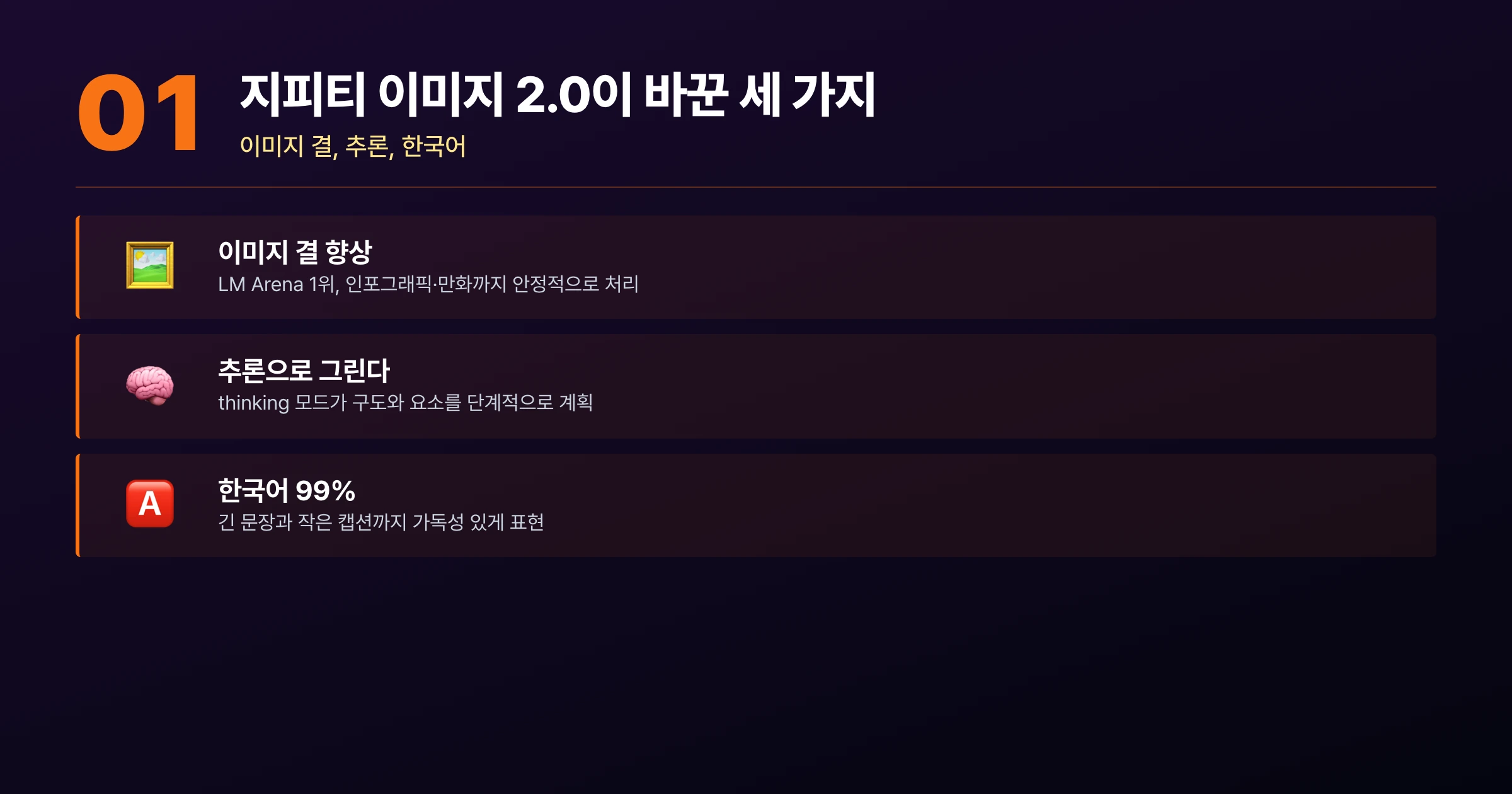 그때부터 이모지를 짧은 한글로 바꿨다. 이미지 결이 한 단계 올라갔다. 다만 긴 글은 여전히 못 썼다. 두 줄 이상 들어가면 글자가 흐트러지거나 줄간격이 무너졌다. 인포그래픽처럼 정보 밀도가 높은 작업은 손으로 마감해야 했다.