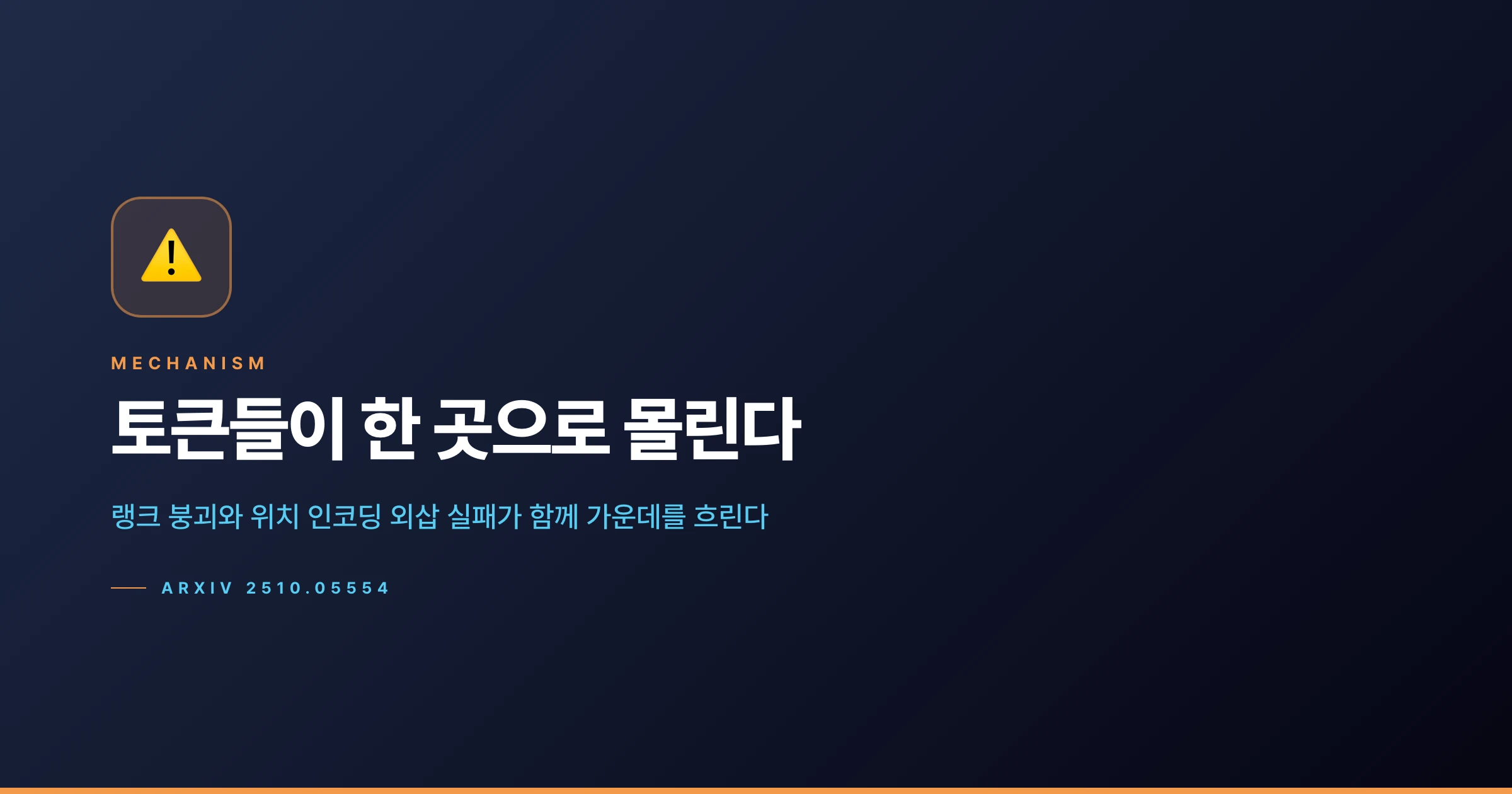이 평탄화가 신경망 층마다 누적되면, 깊은 층으로 갈수록 토큰들이 들고 있는 정보가 한 점으로 수렴해 간다. 여러 색의 물감을 한 통에 부으면 결국 한 가지 갈색이 되듯, 토큰들의 색이 점점 비슷해진다는 뜻이다. 학술 용어로는 랭크 붕괴(rank-collapse) 라고 부른다(출처)