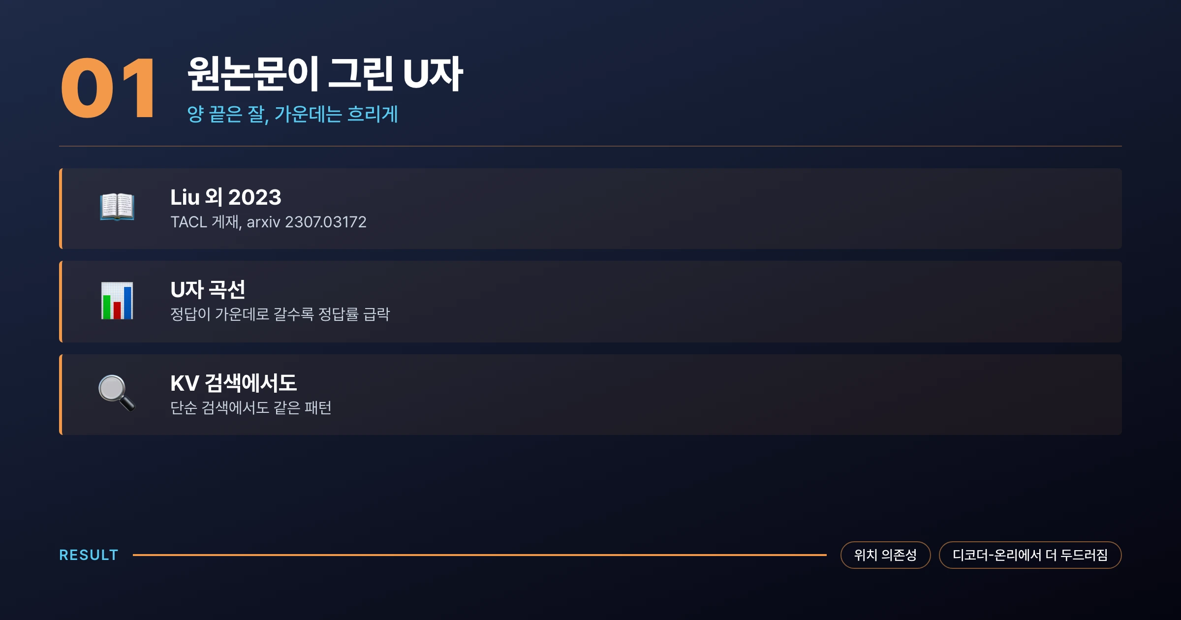 추론이 거의 들어가지 않는 단순한 과제, 즉 큰 사전에서 키 하나를 골라 그 값을 답하는 과제에서도 같은 U자가 반복됐다. 추론이 어려워서 그런 게 아니라, 가운데 위치의 정보를 꺼내 오는 일 자체를 모델이 어려워한다는 신호였다.