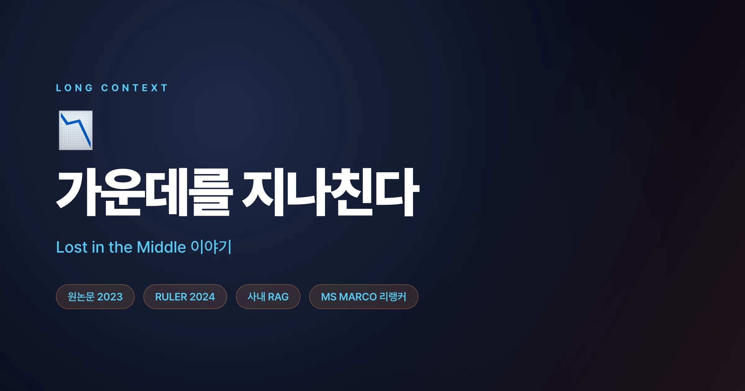 2024년 작은 사내 RAG(Retrieval-Augmented Generation, 외부 문서를 검색해서 그걸 보고 답을 만드는 방식) 프로젝트를 마무리하다 리랭킹(re-ranking) 을 찾아보던 중 이 개념을 처음 만났다. 모델이 받은 프롬프트 안에 정답 문장이 분명히 있는데도 답을 못 하는 일이 자꾸 생겼고, 처음엔 검색이 잘못된 줄 알았다. 정작 문제는 모델이 가운데에 놓인 정보를 지나친다는 데 있었다. 그 뒤로 컨텍스트 길이를 보는 시각이 조금 달라졌다.