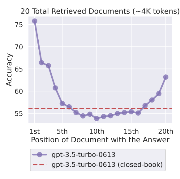 실험 자체는 단순했다. 여러 문서를 모델에게 한꺼번에 입력으로 주고, 정답이 들어 있는 문서의 위치를 첫 번째 자리부터 마지막 자리까지 옮겨 가며 정답률을 쟀다.