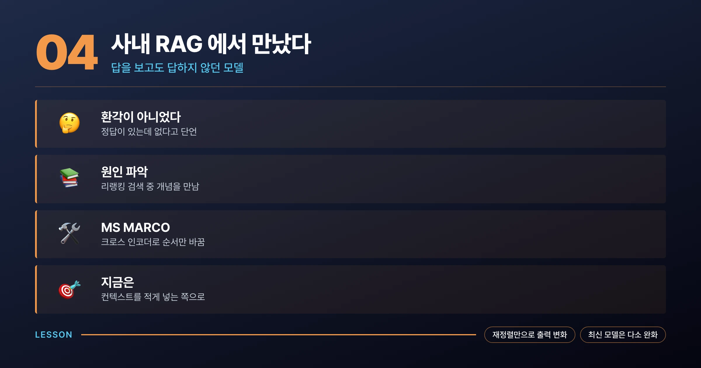 2024년 작은 사내 RAG 프로젝트가 마무리되기 직전에 이상한 현상을 만났다. 사용자가 질문하면 검색은 정확히 됐고, 모델에게 들어가는 프롬프트 안에 정답 문장이 분명히 들어 있었다. 그런데도 모델은 "문서에서 찾을 수 없습니다" 라고 답하는 일이 잦았다.