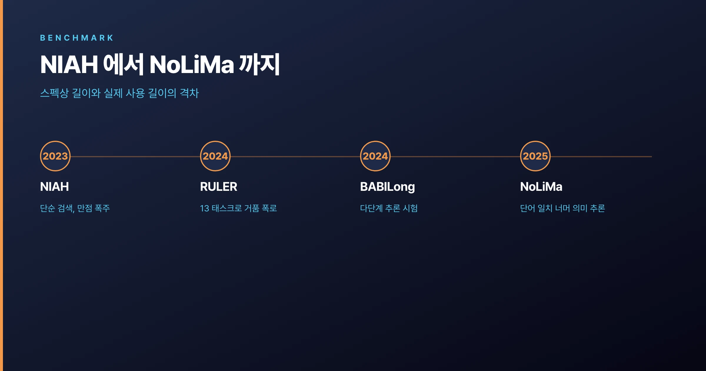 원논문이 나온 뒤 몇 년 사이 평가 도구가 한 단계씩 정교해졌다. 모델 카드(model card, 모델의 사양과 한계를 적어 둔 공식 설명서) 에 적힌 컨텍스트 길이가 그대로 믿을 만한 숫자가 아니라는 사실이 공식 평가로도 잇따라 확인됐다.