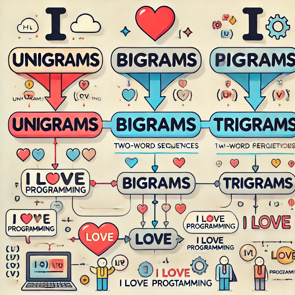 n-gram은 텍스트나 시퀀스에서 연속적으로 나타나는 n개의 항목(단어, 문자 등)을 의미한다. n-gram은 한 단어 이상의 단어 시퀀스를 분석 대상으로 한다. 예를 들어, "I love programming"이라는 문장에서 2-gram(bigram)은 "I love", "love programming" 등이 된다. n-gram은 텍스트의 구조와 패턴을 파악하는 데 유용하여 자연어 처리에서 많이 사용된다. n의 크기에 따라 unigram(1-gram), bigram(2-gram), trigram(3-gram) 등으로 나타낼 수 있다.