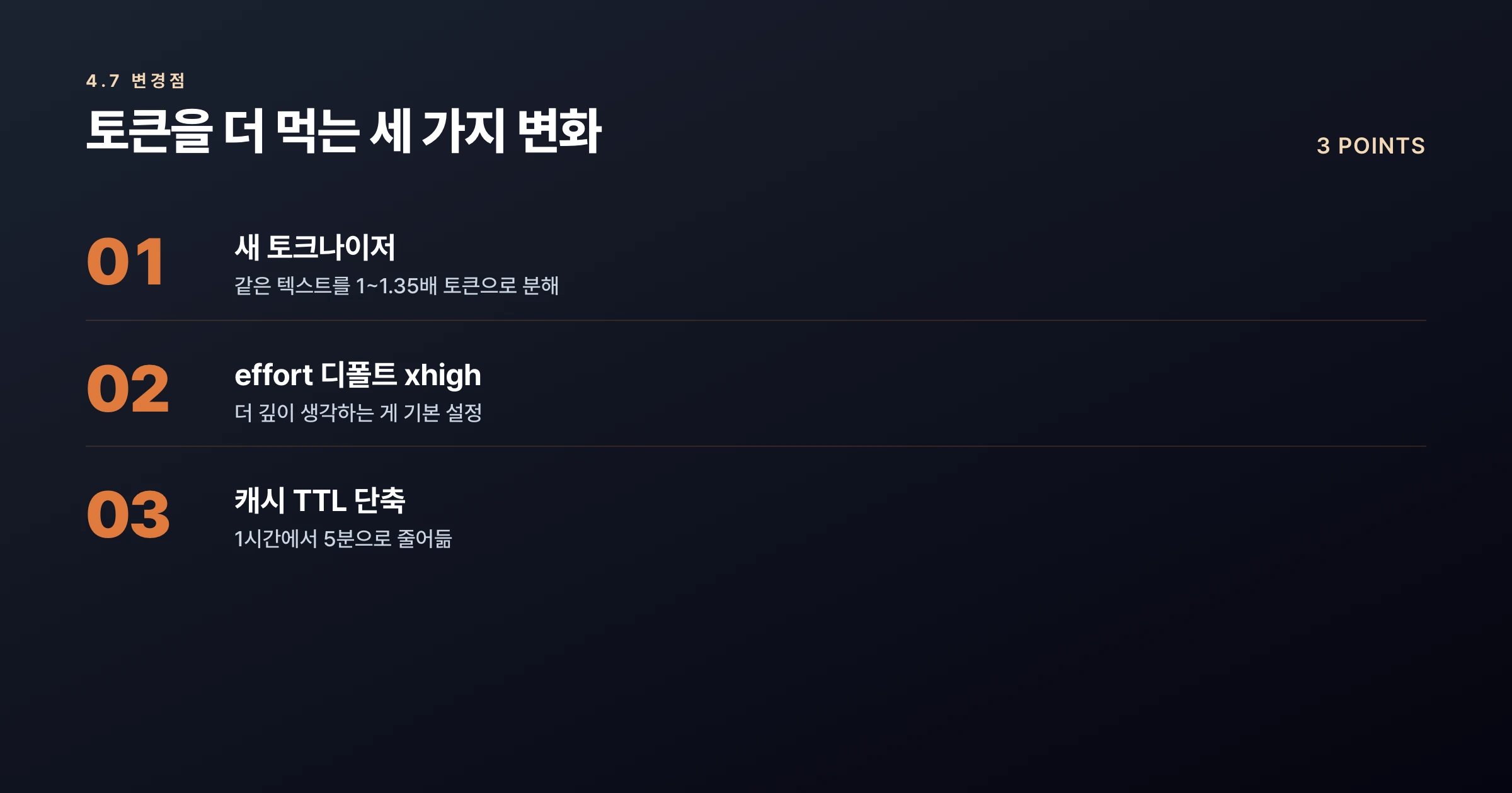 pus 4.7은 토크나이저 자체가 1~1.35배 더 토큰을 쓰고, 디폴트 effort가 한 단계 깊어졌고, 캐시는 더 빨리 사라진다. 같은 작업이 더 비싸진 셈이다.